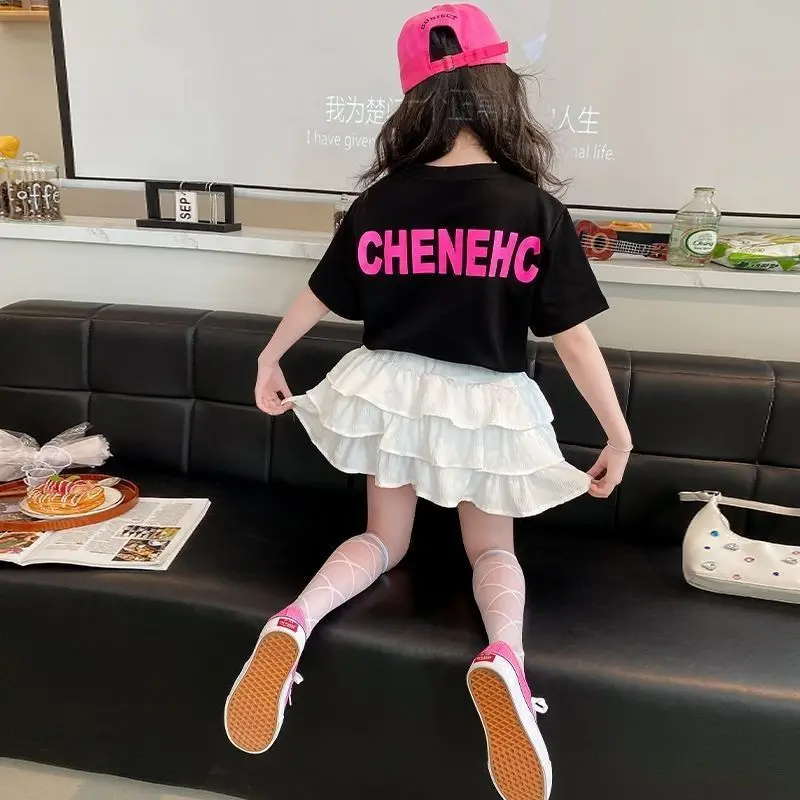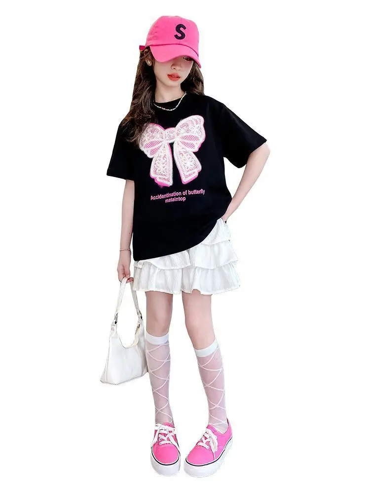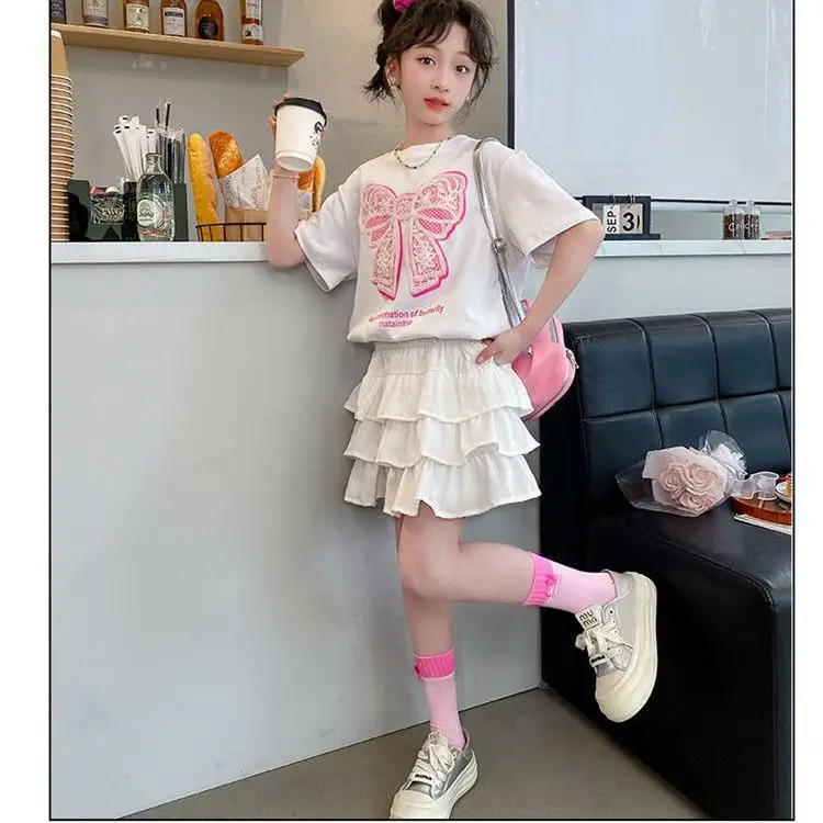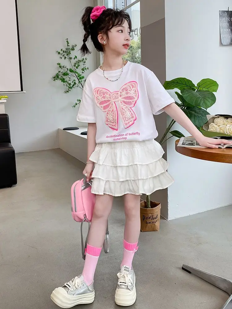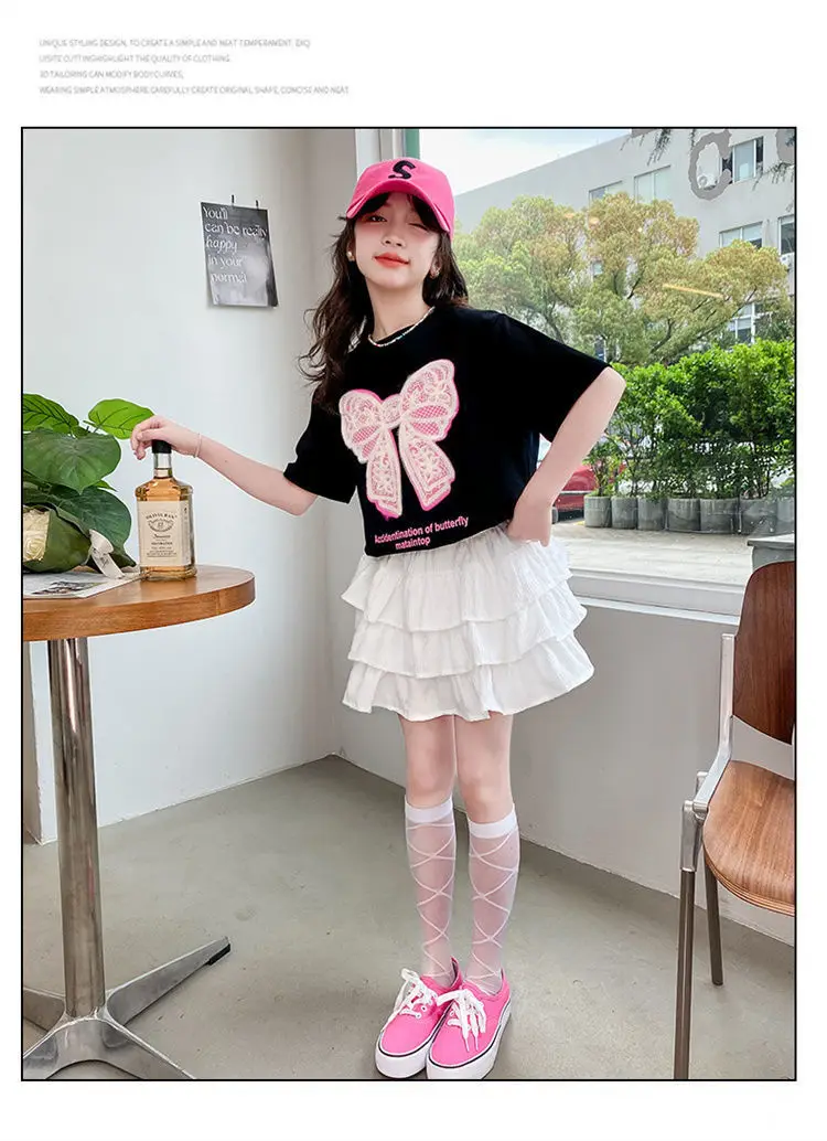 2025 teenager Summer Kids Girls clothes short Sleeve cotton crop top bow t-Shirt top and Tiered Pleated Skirt 5 6 7 8 9 12 year