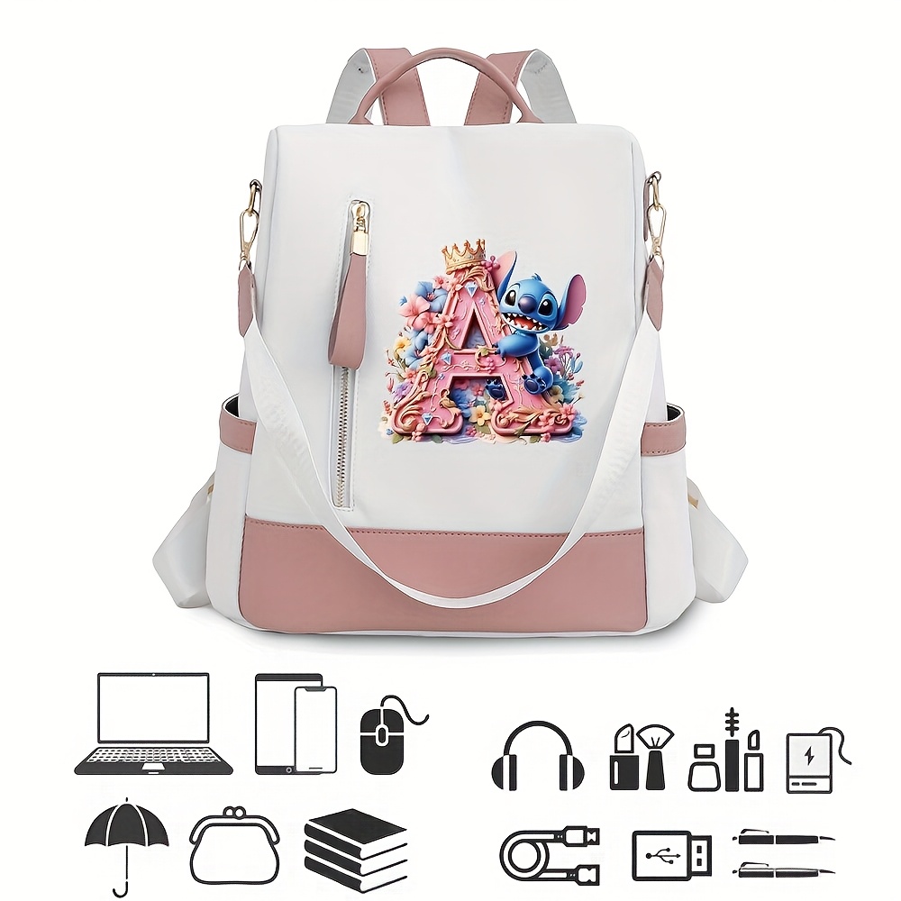 Stitch Backpack with A-Z Letter Print - Durable Polyester, Adjustable Straps, Spacious Design for Daily Commute, Work, Travel & Shopping - Stylish & Functional Backpack for Fans, Perfect Birthday Gift, Cute Backpack, For Teen